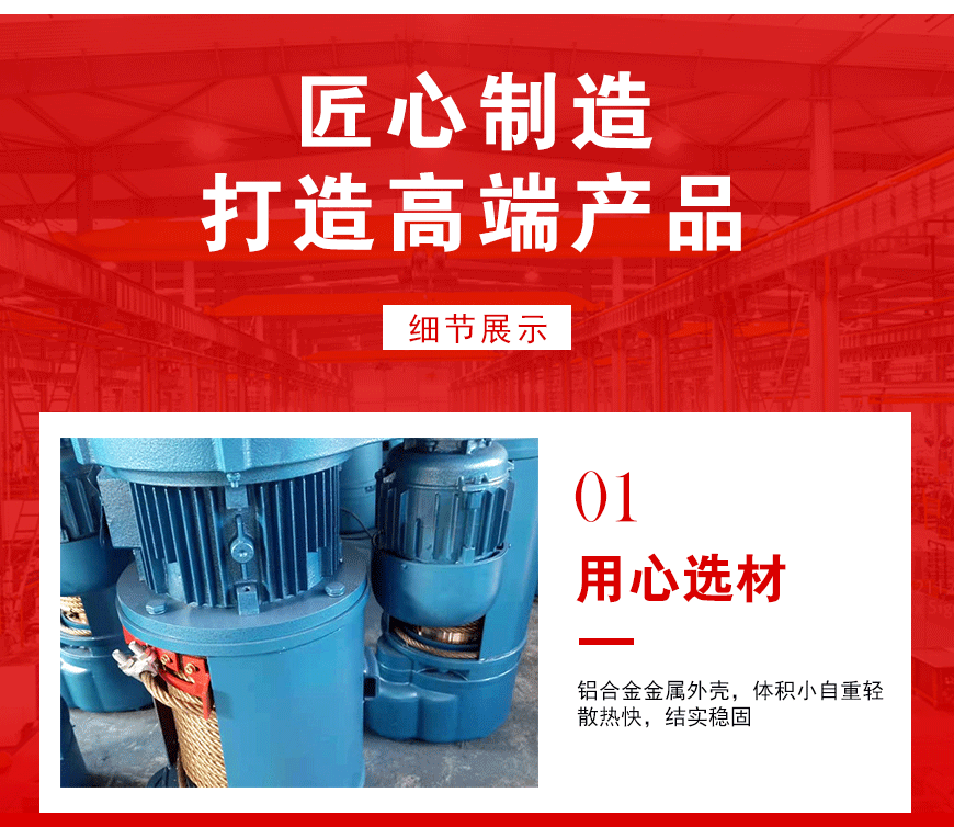 產(chǎn)品介紹:電動(dòng)葫蘆是吊運(yùn)貨物、搬運(yùn)物料的常見設(shè)備。可懸掛在工字鋼等軌道上單獨(dú)使用,也可作為起重機(jī)的重要組成部分一起使用。 電動(dòng)葫蘆具有質(zhì)量輕、體積小、結(jié)構(gòu)緊湊、運(yùn)行平穩(wěn)、操作...