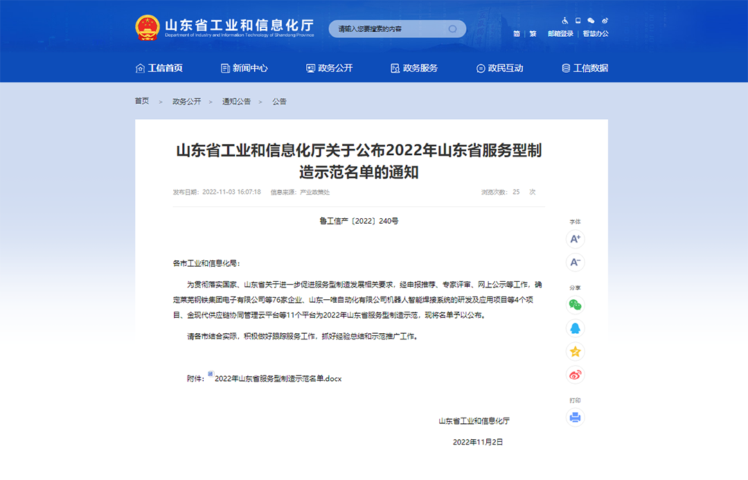 近日,山東省工業和信息化廳發布了《2022年山東省服務型制造示范名單的通知》,龍輝起重入選2022年山東省服務型制造示范企業!